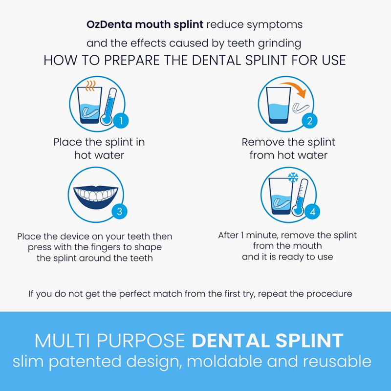 Upplever du spänningar i käken, huvudvärk eller ömma tänder efter sömn? OzDenta bettskena är en professionell lösning, utvecklad av tandläkare, som effektivt skyddar dina tänder mot skador från nattligt tandgnisslande (bruxism) och lindrar symtom på käkledsbesvär (TMJ). Denna ultralätta och flexibla bettskena formar du enkelt själv hemma med det medföljande gör-det-själv-avtrycket – helt utan dyra tandläkarbesök.